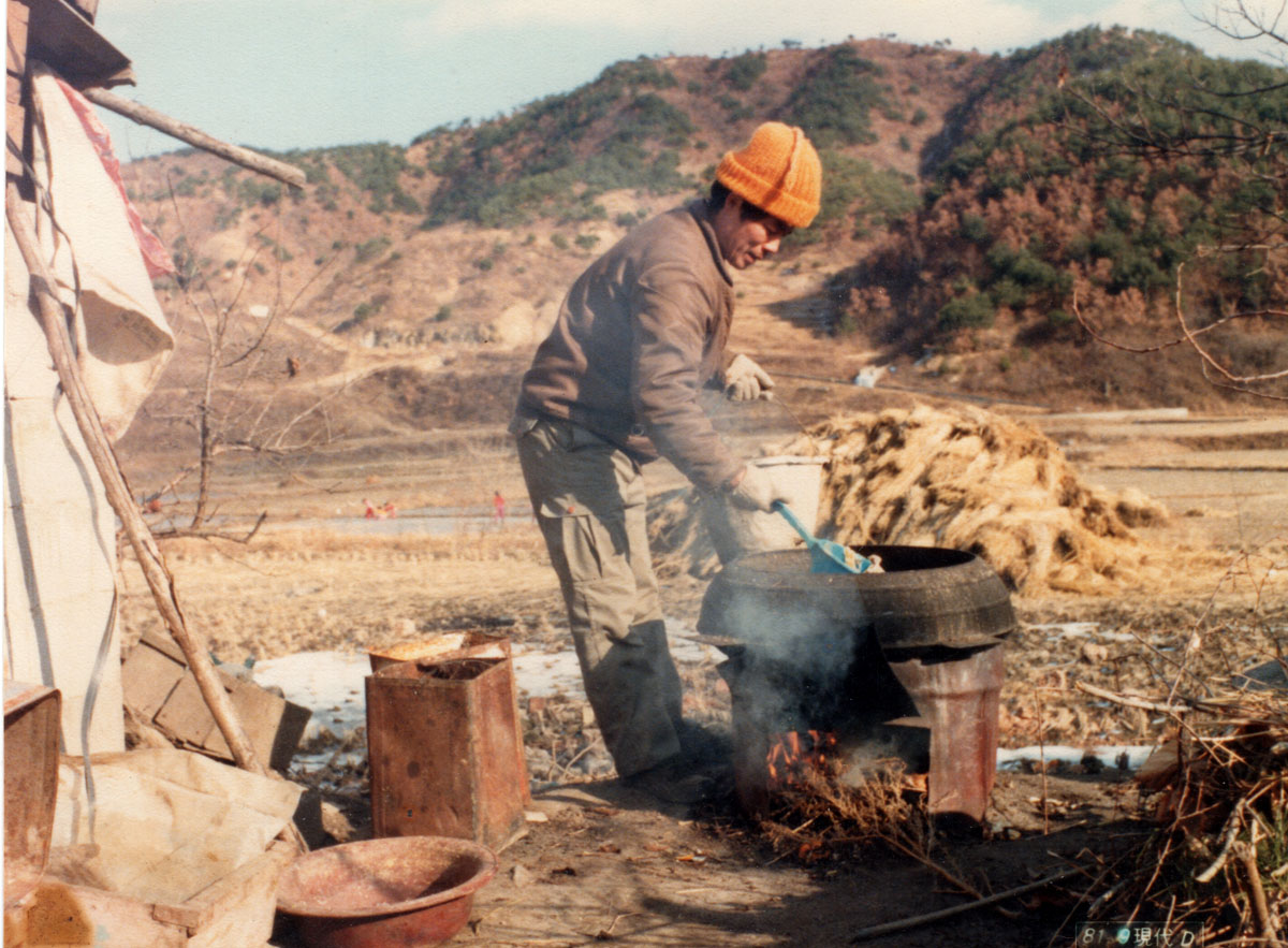 1981년 겨울, 강원도 양구군의 어느 농가 풍경입니다. 오렌지색 털모자를 쓰고 두툼한 작업복을 입은 농부가 아궁이 위에 걸린 큰 솥에서 김이 무럭무럭 나는 죽을 끓이고 있습니다. 파란색 국자를 든 그의 모습은 정성스럽고 따뜻해 보입니다.