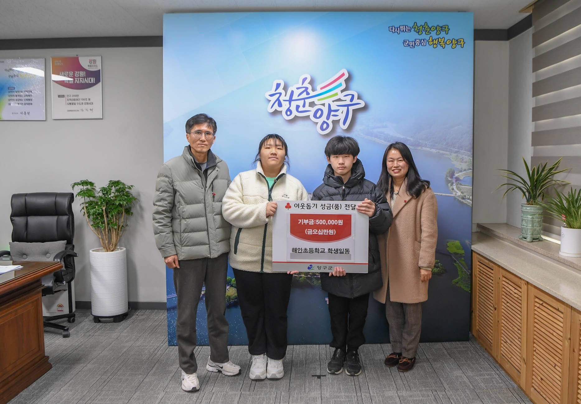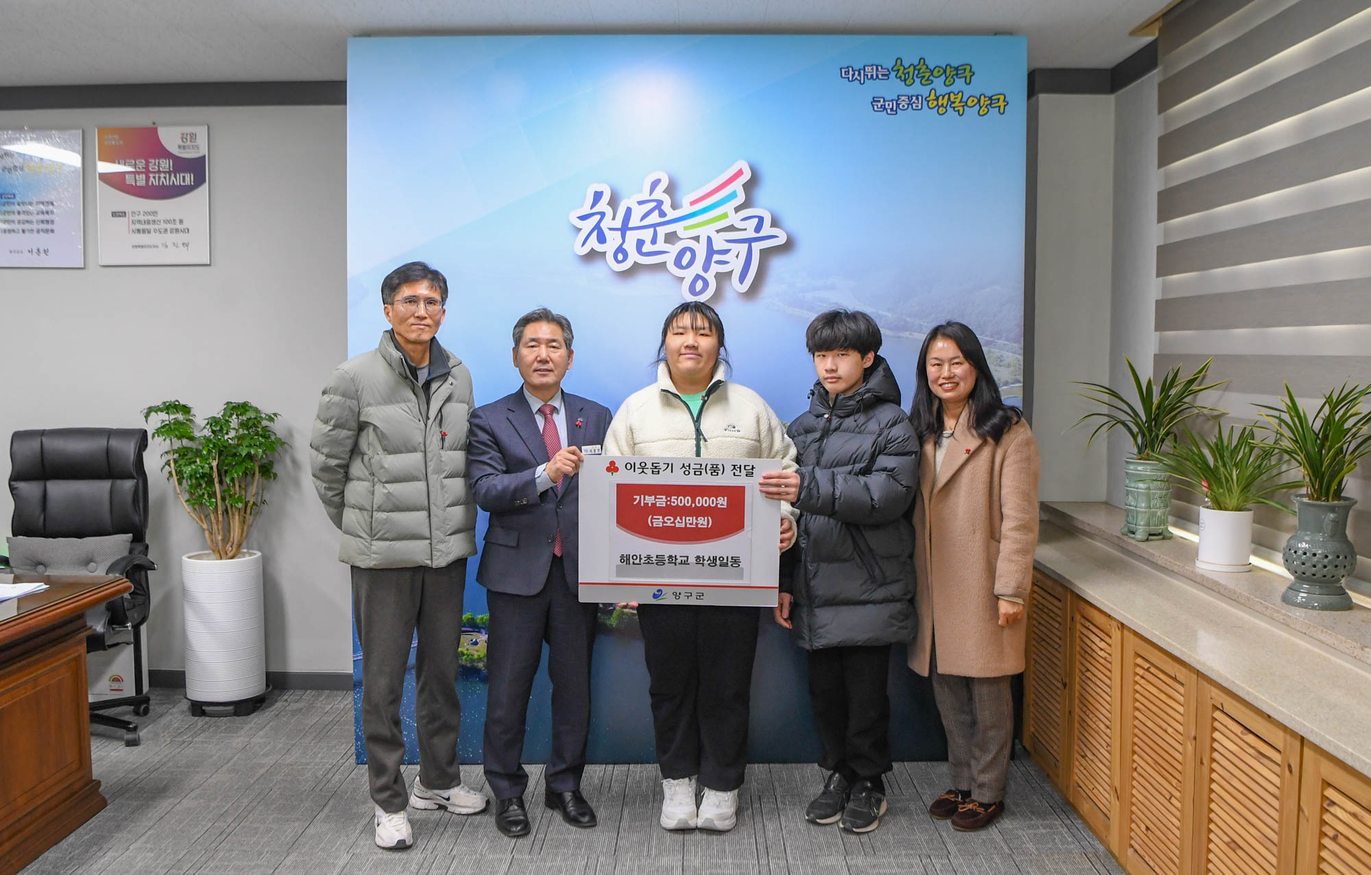 해안초등학교(교장 김진도) 학생 일동은 9일 오후 양구군청을 방문해 플리마켓 운영 수익금 50만 원을 이웃돕기 성금으로 서흥원 양구군수에게 전달했다.