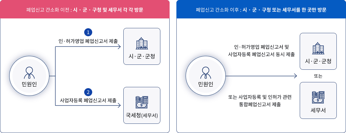 자영업 등 사업자가 폐업신고를 하여야 할 경우 세무서(사업자등록 관청)와 군청(인허가 관청)을 각각 방문할 필요없이 한 곳에서만 통합 신고하면 두 행정기관 간 협업을 통해 일괄적으로 폐업신고가 처리되는 군민중심의 편리한 민원편의 서비스입니다.
