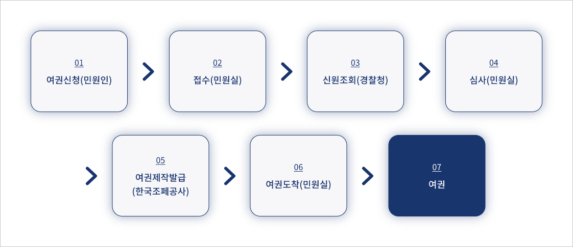 여권신청(민원인)→ 접수(민원실)→ 신원조회(경찰청)→ 심사(민원실)→ 여권제작발급(한국조폐공사)→ 여권도착(민원실)→ 여권