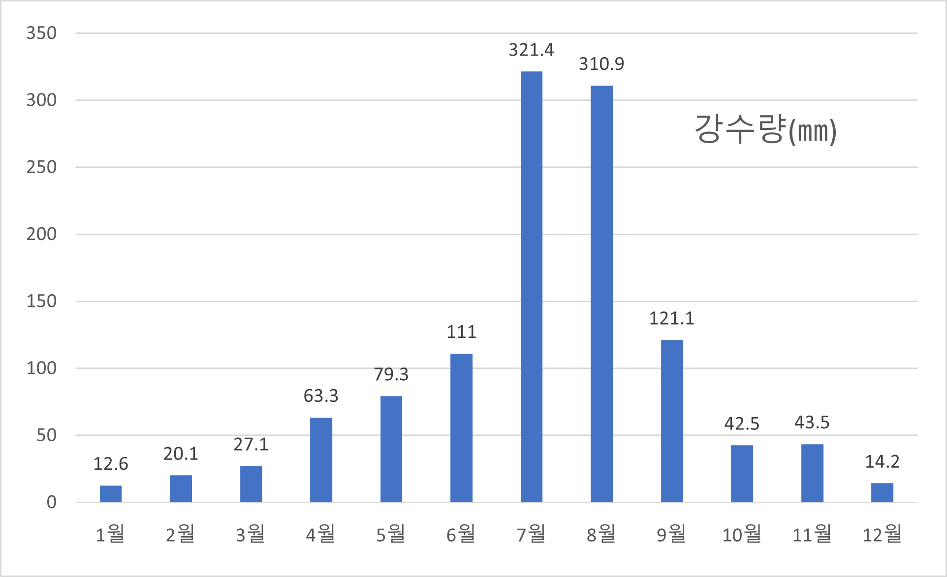 연강수량은 1167.0mm이고 여름철(6~8월) 강수량은 743.3mm로 약 63.7%를 차지합니다.