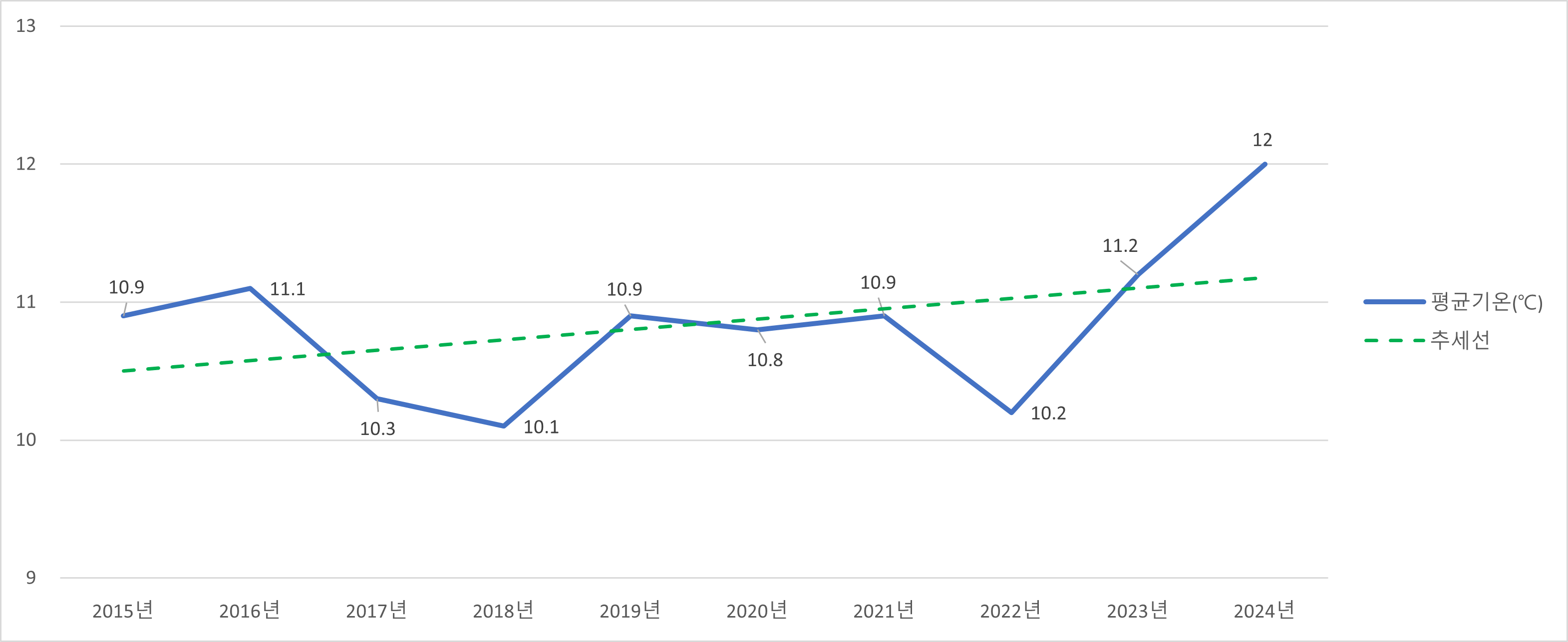 | 연평균기온(℃) | 10.9 | 11.1 | 10.3 | 10.1 | 10.9 | 10.8 | 10.9 | 10.2 | 11.2 | 12.0 |