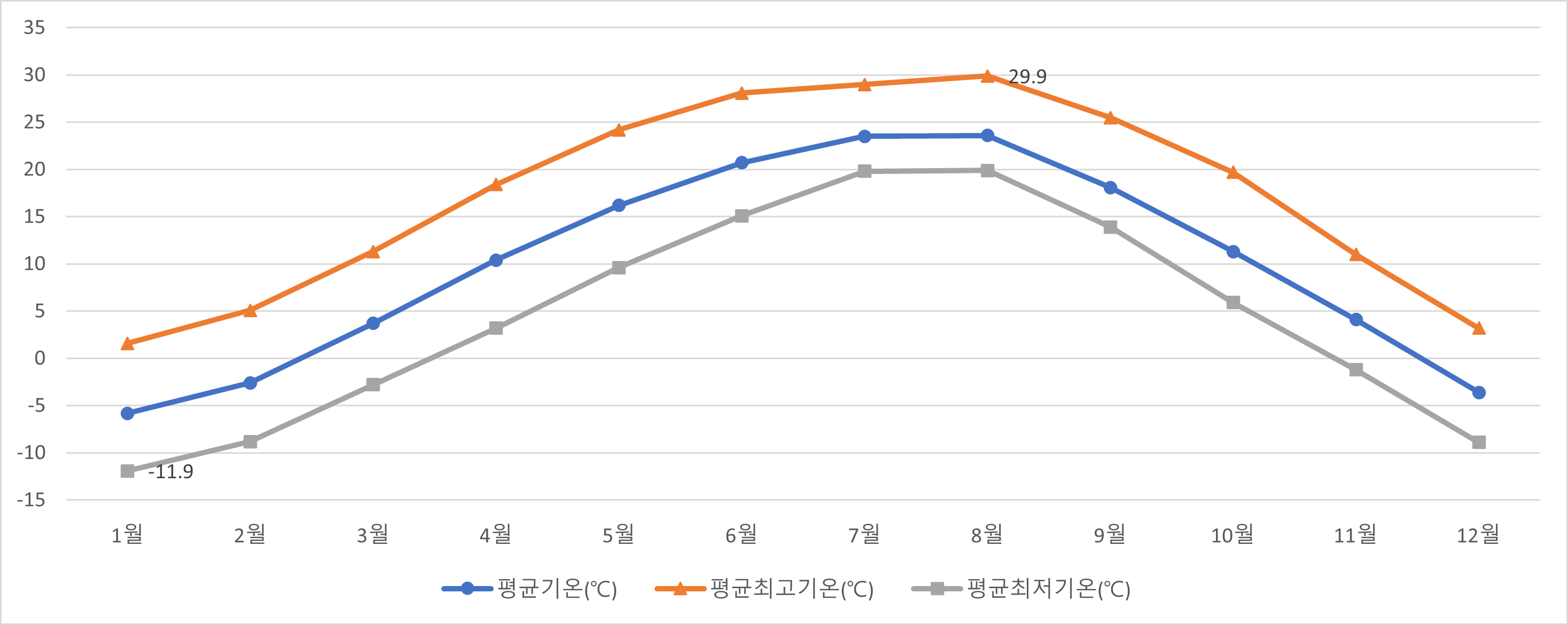 평균최고기온은 8월 29.9℃이고, 평균최저기온은 1월 –11.9℃입니다.