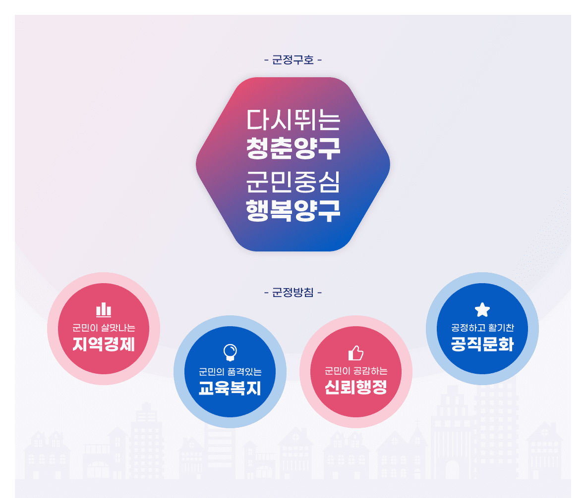 양구군민이 모든 곳에서 중심이 되고 주인공 되는 양구군의 큰 변화를 이룰 수 있도록 민선8기 향후 4년간 군정운영의 구심점이 될 군정비전을 설정