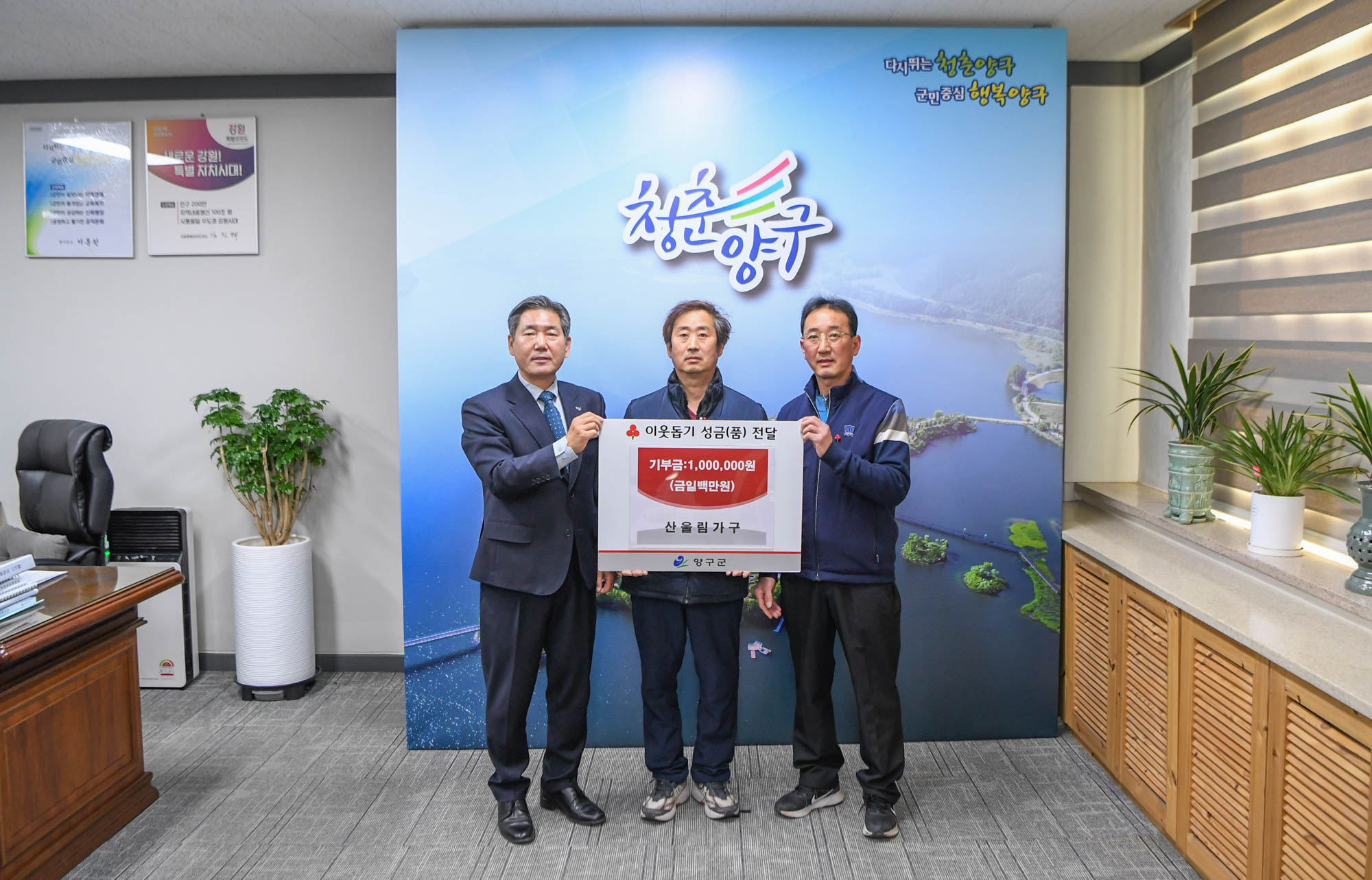 산울림가구 주식회사는 12일 오전 양구군청을 방문해 이웃돕기 성금 100만 원을 서흥원 양구군수에게 전달했다.