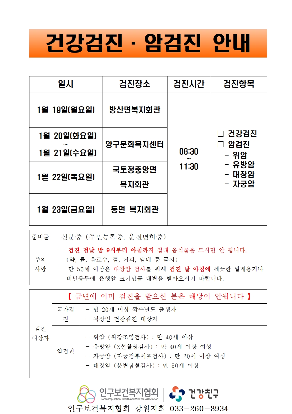 출장검진기관: 인구보건복지협회, 문의 사항 -> 033-260-8934