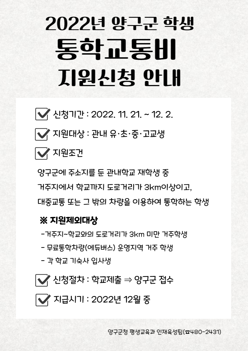 2022년 하반기 학생 통학 교통비 지원사업 신청안내