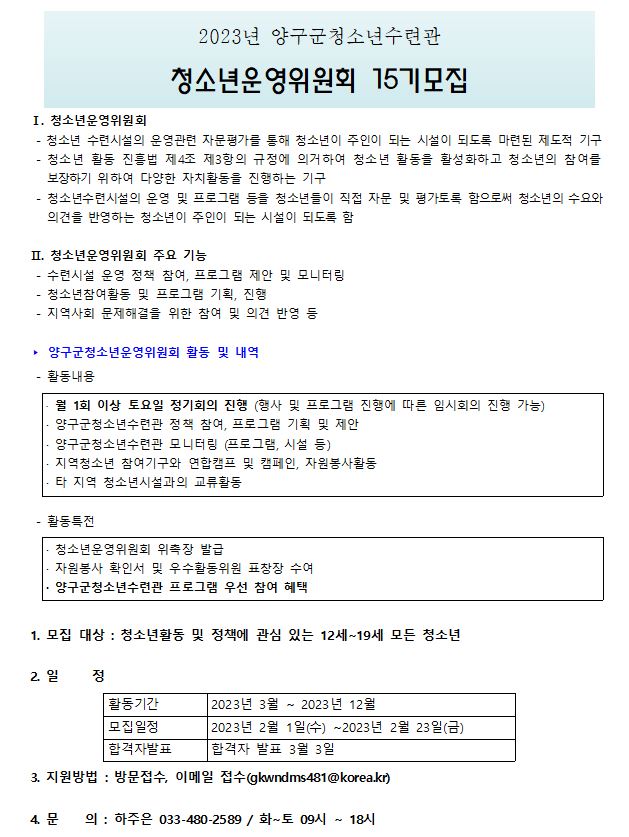 2023 양구군청소년수련관 청소년운영위원 모집공고