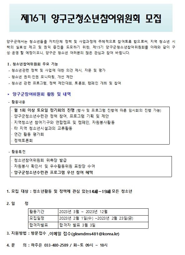2023 양구군청소년수련관 청소년운영위원 모집공고