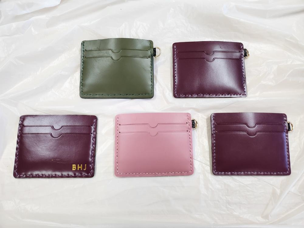 각자 좋아하는 색깔을 선택하여서 구멍 뚫기-바느질-기리메(가죽 옆면을 깔끔하게 정리)를 작업을 하여 카드지갑이 완성되었습니다.